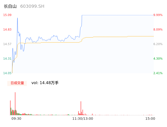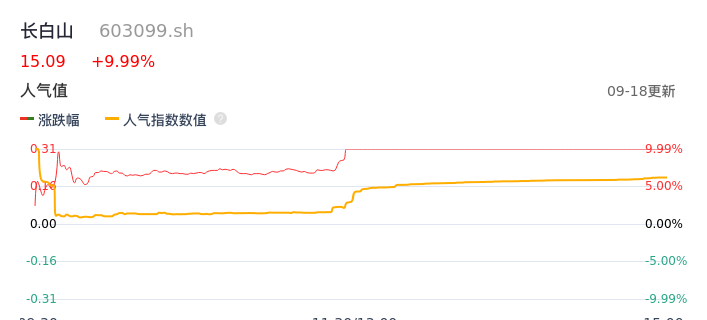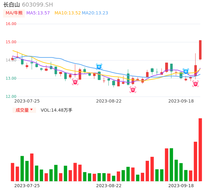 09月18日,长白山收报15.09,股价涨幅9.99%,成交金额2.13亿元,换手率5.43%。