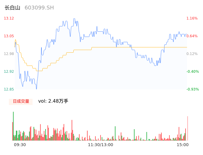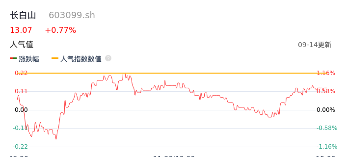 09月14日,长白山收报13.07,股价涨幅0.77%,成交金额3222.12万元,换手率0.93%。