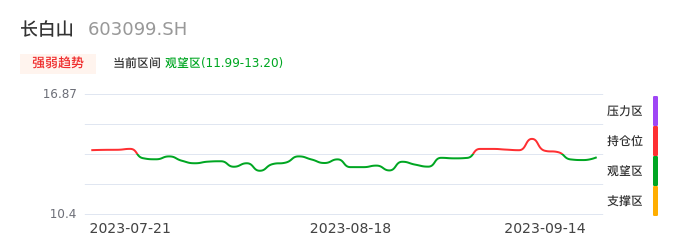 我们来看一下该股的九方特色指标强弱趋势的情况:长白山自09月12日从持仓区下穿到观望区。股价近期持续下跌后,短期出现止跌迹象。后续重点关注能否再次站上多空分界点:13.20元。如未能有效突破则可能进入新一轮空头行情。