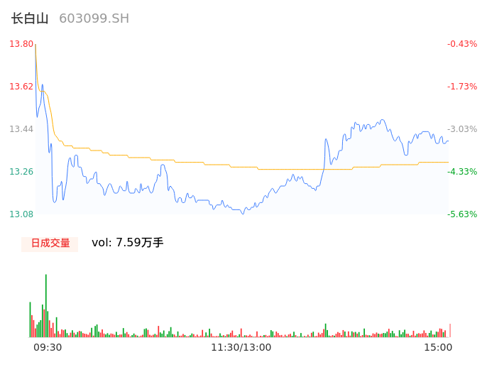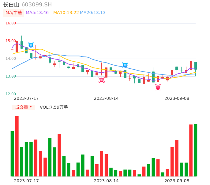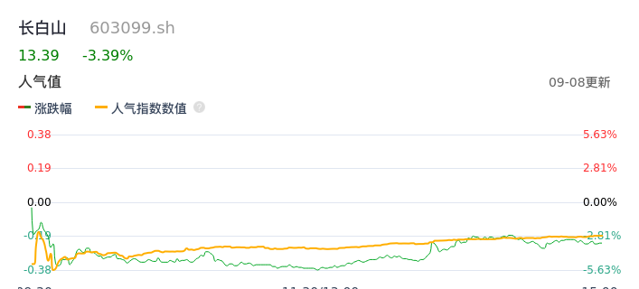09月08日,长白山收报13.39,股价涨幅-3.39%,成交金额1.01亿元,换手率2.85%。