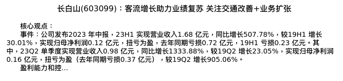 值得注意的是:2023年09月广发证券的嵇文欣/王永锋/包晗分析师,首次发布关于长白山的研究报告,标题为:长白山(603099):客流增长助力业绩复苏 关注交通改善+业务扩张。