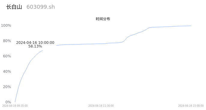 603099长白山2024年04月16日成交15.48万手,成交金额3.11亿元,相较昨日缩量5.83万手,换手率5.80%,成交清淡。