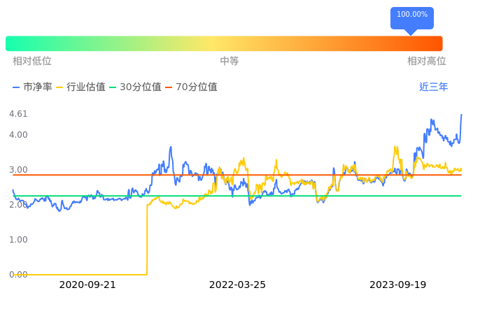 长白山当前市净率PB为4.15,在所属的旅游及景区中,市净率PB排14,前五名分别为中青旅市净率1.45、黄山旅游市净率2.11、丽江股份市净率2.14、三特索道市净率2.22、峨眉山A市净率2.22。长白山当前市净率PB为4.15,超过近3年100.00%的历史数据。