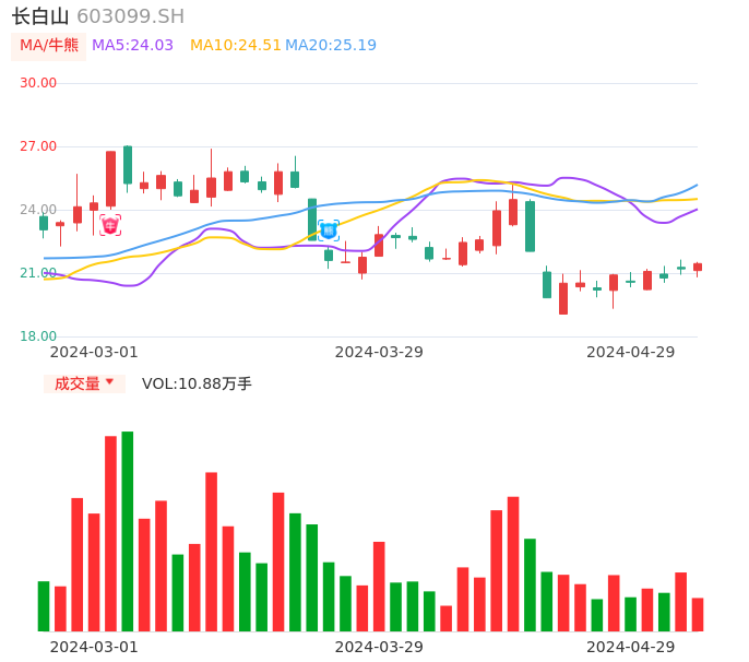 04月29日,长白山收报21.45,股价涨幅1.18%,成交金额2.32亿元,换手率4.08%。