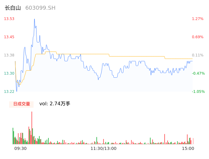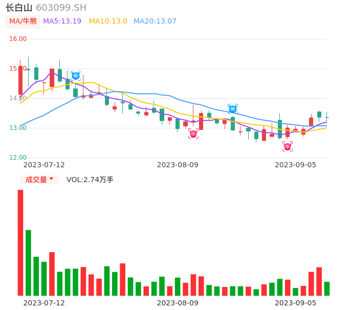 09月05日,长白山收报13.35,股价涨幅-0.07%,成交金额3664.21万元,换手率1.03%。