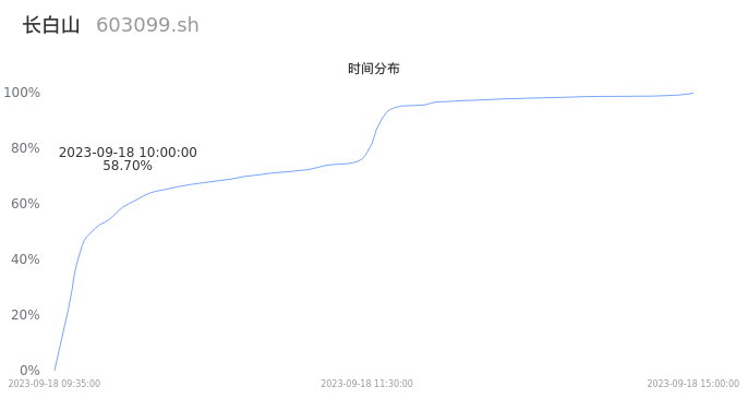 603099长白山2023年09月18日成交14.48万手,成交金额2.13亿元,相较昨日放量5.39万手,换手率5.43%,成交清淡。