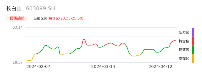 我们来看一下该股的九方特色指标强弱趋势的情况:长白山近日从观望区上穿到持仓区。股价短期站稳多头区域,上升动能仍较为充足,可积极关注。后续重点关注上方压力位:25.50元是否能突破上攻。