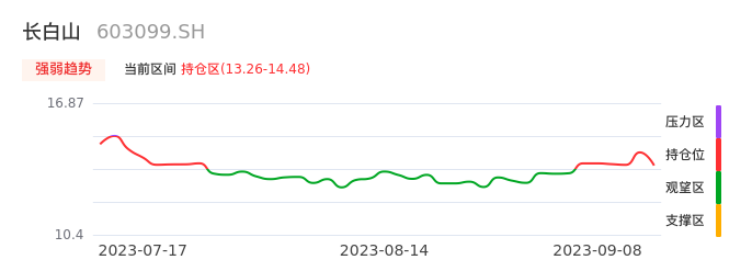 我们来看一下该股的九方特色指标强弱趋势的情况:长白山自09月01日从观望区上穿到持仓区。股价近期在多头区域回调整理。后续重点关注多空分界点的争夺:13.26元。如未能有效站稳则可能重新回到空头行情。