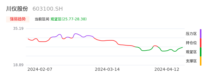 我们来看一下该股的九方特色指标强弱趋势的情况:川仪股份自04月02日从持仓区下穿到观望区。股价近期持续下跌后,短期出现止跌迹象。后续重点关注能否再次站上多空分界点:28.38元。如未能有效突破则可能进入新一轮空头行情。