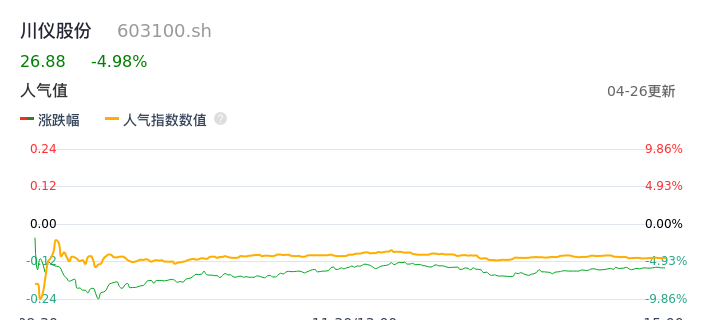 04月26日,川仪股份收报26.88,股价涨幅-4.98%,成交金额2.75亿元,换手率2.66%。
