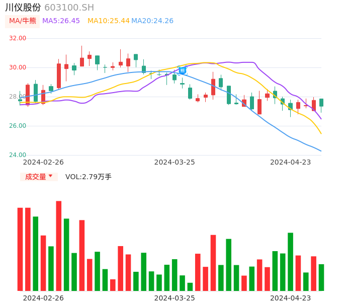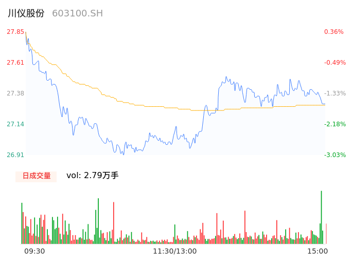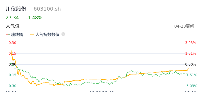 04月23日,川仪股份收报27.34,股价涨幅-1.48%,成交金额7602.37万元,换手率0.71%。
