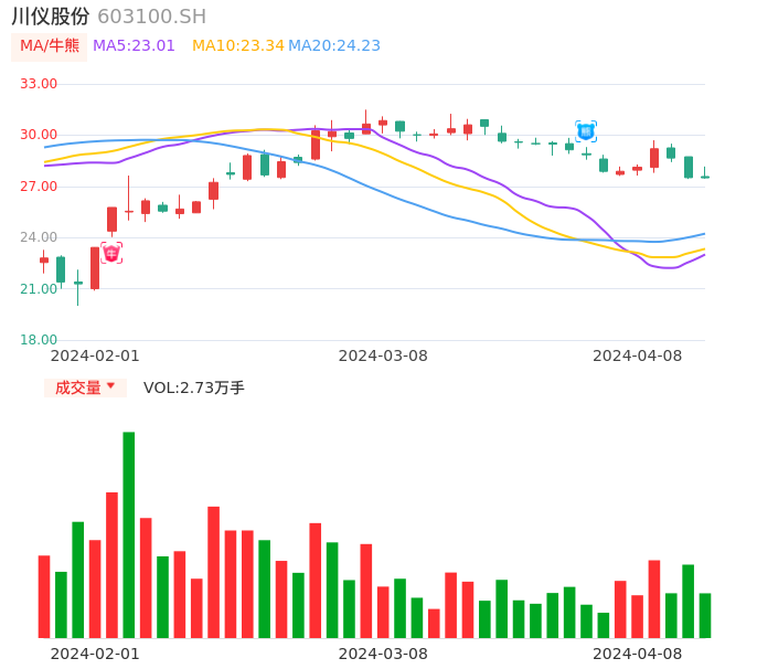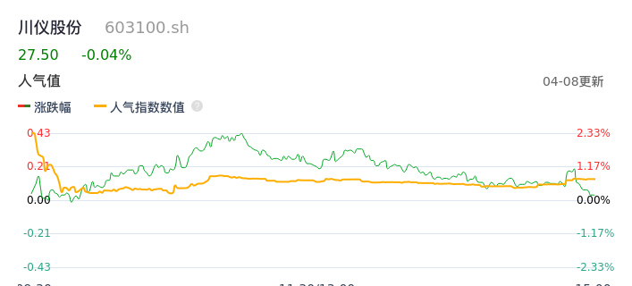 04月08日,川仪股份收报27.50,股价涨幅-0.04%,成交金额7577.20万元,换手率0.70%。