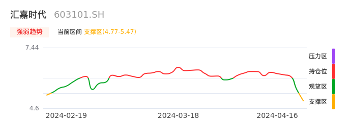 我们来看一下该股的九方特色指标强弱趋势的情况:汇嘉时代近日从观望区进入支撑区。股价出现一波快速下跌行情,目前下跌动能仍未衰竭。建议继续谨慎观望。注意今日下方支撑位:4.77元,如有效跌破将可能出现新一轮下跌
