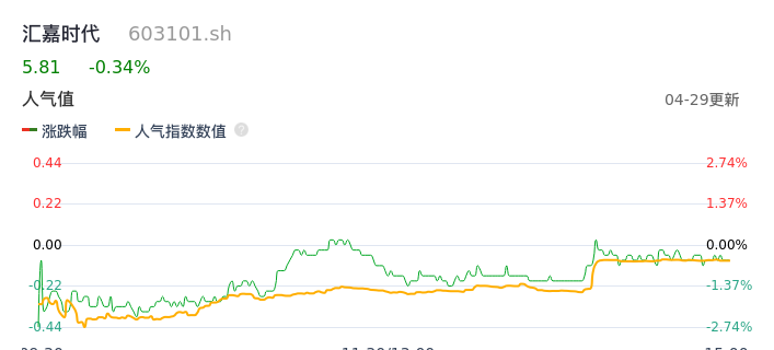 04月29日,汇嘉时代收报5.81,股价涨幅-0.34%,成交金额5168.60万元,换手率1.90%。