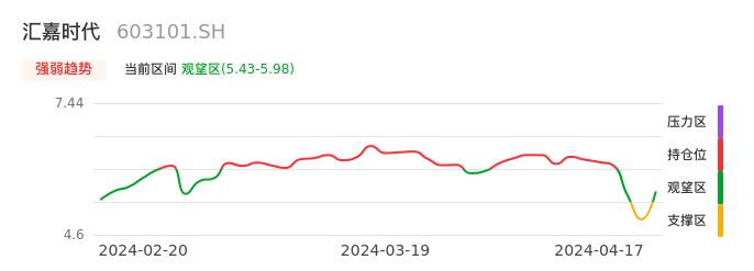 我们来看一下该股的九方特色指标强弱趋势的情况:汇嘉时代近日从支撑区回到观望区。股价经过前期快速下跌后已经出现止跌迹象。下跌动能有所衰竭,股价目前处于反弹阶段,后续重点关注能否站上多空分界点:5.98元。如未能有效突破则说明弱势反弹行情结束。后续可能再次进入空头行情。