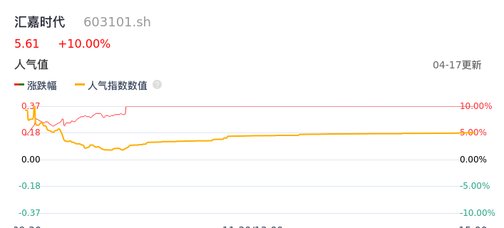 04月17日,汇嘉时代收报5.61,股价涨幅10.00%,成交金额3162.38万元,换手率1.23%。