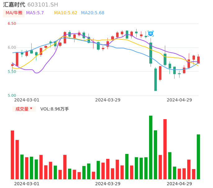 04月29日,汇嘉时代收报5.81,股价涨幅-0.34%,成交金额5168.60万元,换手率1.90%。