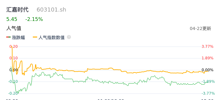 04月22日,汇嘉时代收报5.45,股价涨幅-2.15%,成交金额2168.06万元,换手率0.84%。