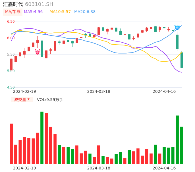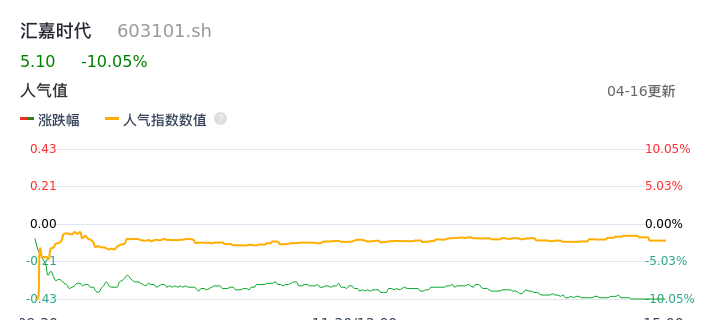04月16日,汇嘉时代收报5.10,股价涨幅-10.05%,成交金额4993.26万元,换手率2.04%。