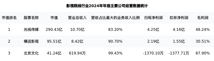 横店影视最新报告期数据为年报,下表汇总了影视院线行业内市值靠前的公司年报主要经营数据