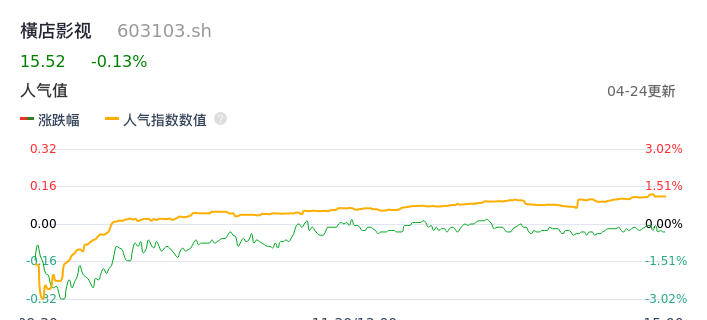 04月24日,横店影视收报15.52,股价涨幅-0.13%,成交金额7043.39万元,换手率0.72%。