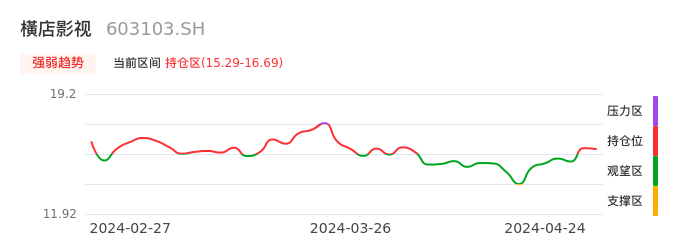 我们来看一下该股的九方特色指标强弱趋势的情况:横店影视近日从观望区上穿到持仓区。股价短期站上多头区域,但还未完全站稳。后续重点关注多空分界点的争夺:15.29元。如未能有效站稳则可能重新回到空头行情。