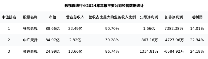 横店影视最新报告期数据为年报,下表汇总了影视院线行业内市值靠前的公司年报主要经营数据