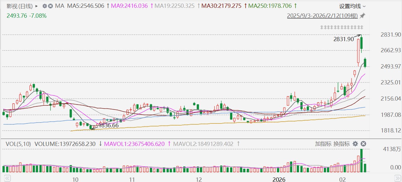 格隆汇2月12日|此前因“春节档+ Seedance”起飞的影视股今日再度集体回调,为连续第二日回调。其中,光线传媒跌超10%,欢瑞世纪、横店影视、博纳影业、金逸影视10CM跌停,幸福蓝海、中国电影跌超7%,上海电影、华谊兄弟跌超6%,华策影视、文投控股、华智数媒跌超4%。