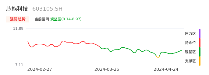 我们来看一下该股的九方特色指标强弱趋势的情况:芯能科技自04月17日从支撑区回到观望区。股价前期快速下跌后经过中途弱势整理。目前短期处于弱势反弹迹象,后续重点关注能否站上多空分界点:8.97元。如未能有效突破则说明弱势反弹行情结束。后续可能再次进入空头行情。