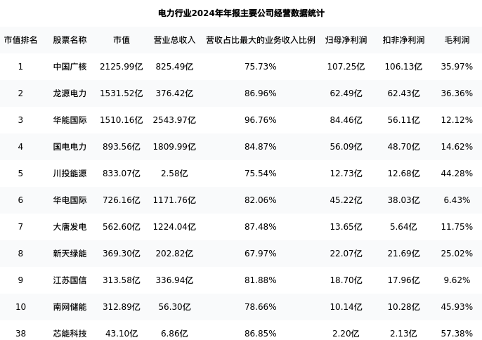 芯能科技最新报告期数据为年报,下表汇总了电力行业内市值靠前的公司年报主要经营数据