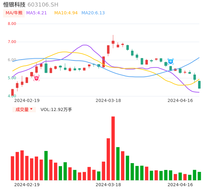 04月16日,恒银科技收报4.42,股价涨幅-9.98%,成交金额5801.30万元,换手率2.48%。