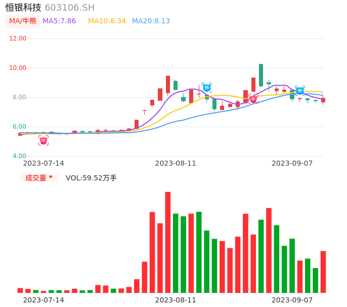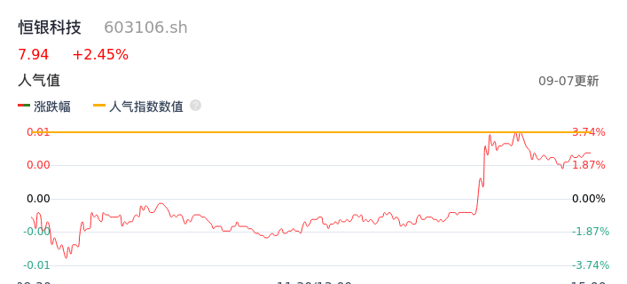 09月07日,恒银科技收报7.94,股价涨幅2.45%,成交金额4.64亿元,换手率11.43%。