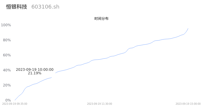 首先我们来看当日成交的时间分布。将今日交易时间按照5分钟的时间间隔进行切片,并绘制分布直方图进行观察。可以发现,10点之前的成交量占全天成交量的21.19%,这说明,该股票活跃时段换手率一般,资金热度较一般。