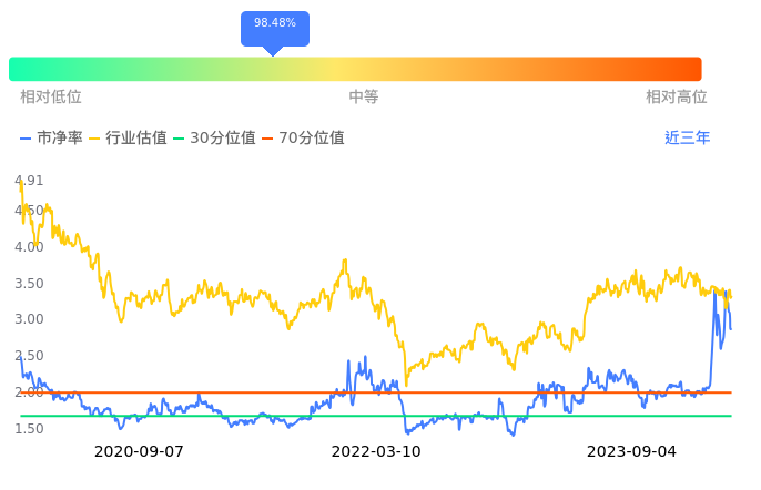 恒银科技当前市净率PB为2.88,在所属的计算机设备中,市净率PB排29,前五名分别为华铭智能市净率1.38、智莱科技市净率1.38、思维列控市净率1.44、旋极信息市净率1.55、同方股份市净率1.56。恒银科技当前市净率PB为2.88,超过近3年98.48%的历史数据。