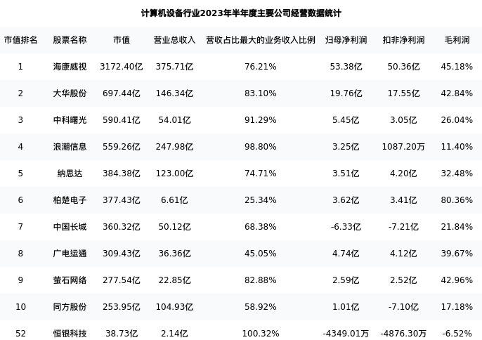 恒银科技最新报告期数据为半年度,下表汇总了计算机设备行业内市值靠前的公司半年度主要经营数据