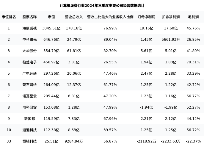恒银科技最新报告期数据为三季度,下表汇总了计算机设备行业内市值靠前的公司三季度主要经营数据