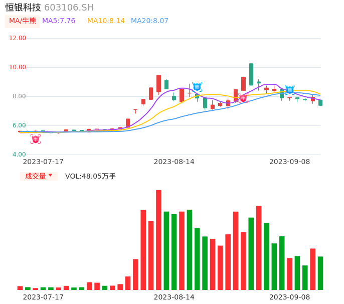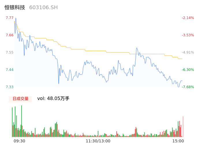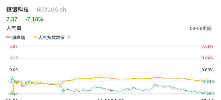 09月08日,恒银科技收报7.37,股价涨幅-7.18%,成交金额3.60亿元,换手率9.23%。