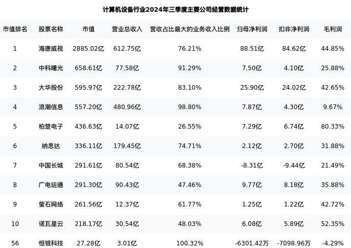 恒银科技最新报告期数据为三季度,下表汇总了计算机设备行业内市值靠前的公司三季度主要经营数据