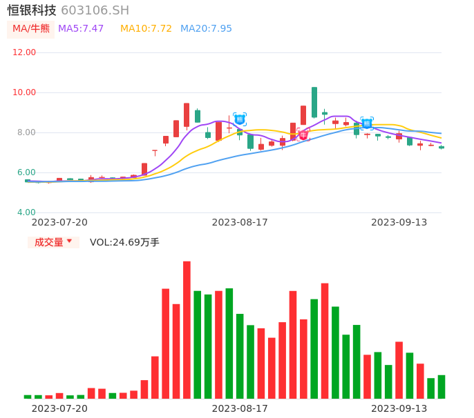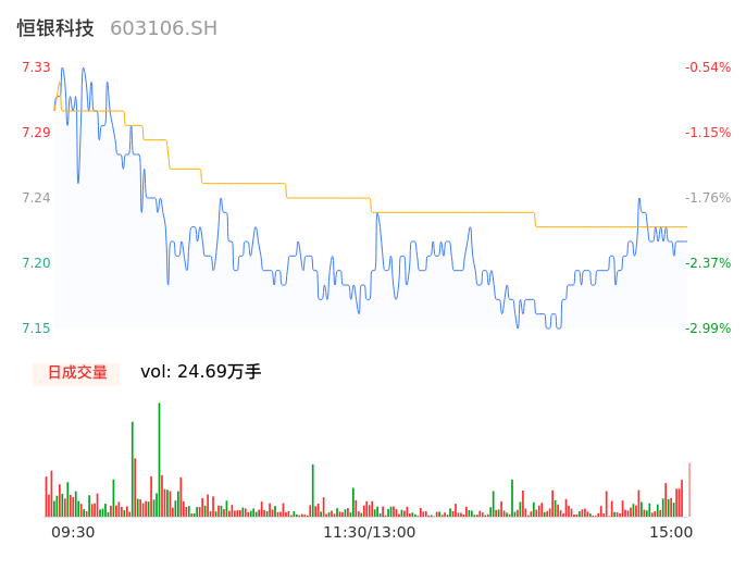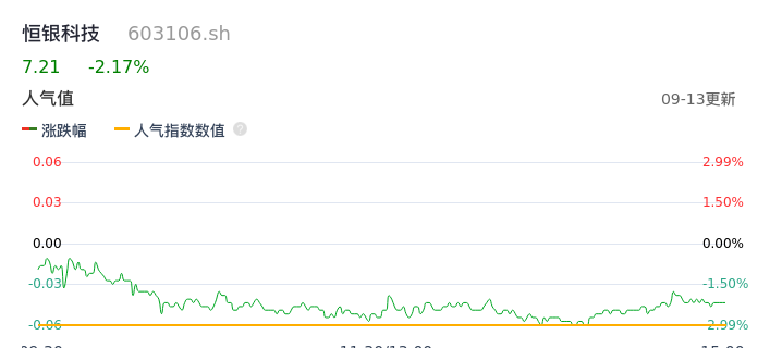 09月13日,恒银科技收报7.21,股价涨幅-2.17%,成交金额1.78亿元,换手率4.74%。