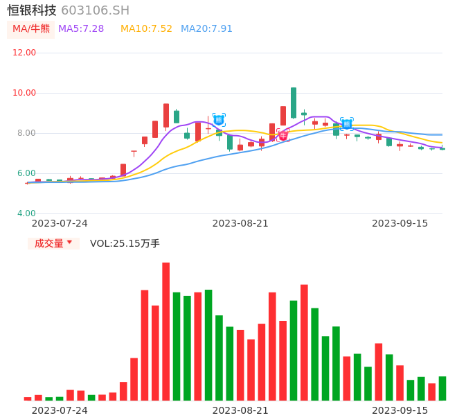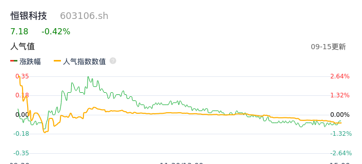 09月15日,恒银科技收报7.18,股价涨幅-0.42%,成交金额1.82亿元,换手率4.83%。