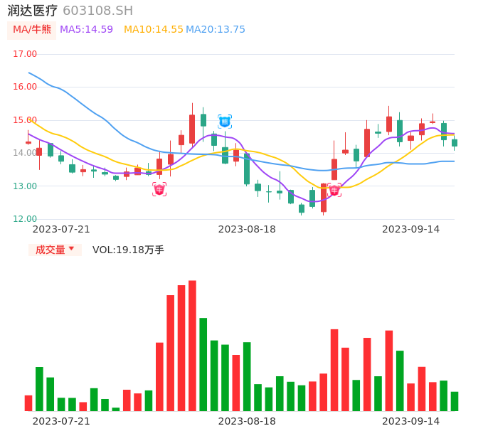 09月14日,润达医疗收报14.21,股价涨幅-1.32%,成交金额2.73亿元,换手率3.31%。