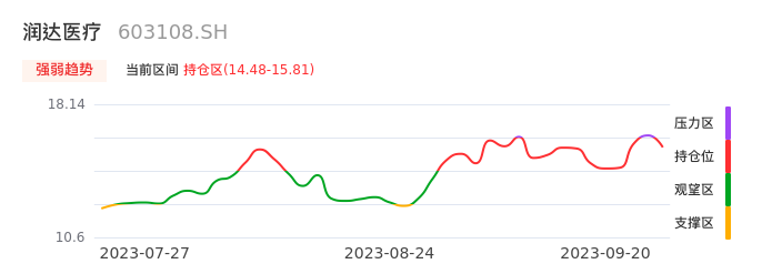 我们来看一下该股的九方特色指标强弱趋势的情况:润达医疗近日从压力区回到持仓区。股价快速拉升后出现持续调整。后续主要关注下方支撑位:14.48元是否能启稳回升。