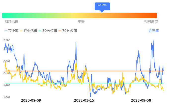 润达医疗当前市净率PB为2.18,在所属的医药商业中,市净率PB排20,前五名分别为重药控股市净率0.85、瑞康医药市净率0.92、嘉事堂市净率0.96、上海医药市净率0.97、国药一致市净率1.04。润达医疗当前市净率PB为2.18,超过近3年72.39%的历史数据。