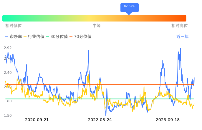 润达医疗当前市净率PB为2.37,在所属的医药商业中,市净率PB排20,前五名分别为重药控股市净率0.88、瑞康医药市净率0.97、上海医药市净率0.99、嘉事堂市净率0.99、国药一致市净率1.06。润达医疗当前市净率PB为2.37,超过近3年82.64%的历史数据。
