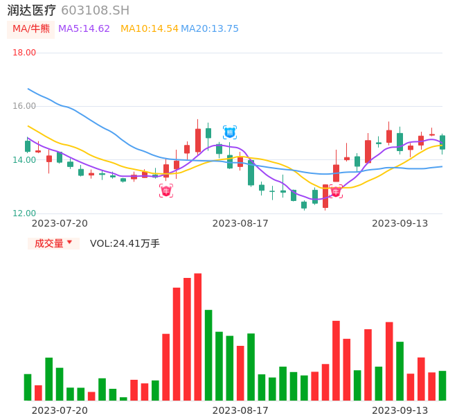 09月13日,润达医疗收报14.40,股价涨幅-3.68%,成交金额3.54亿元,换手率4.21%。