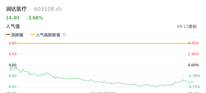 09月13日,润达医疗收报14.40,股价涨幅-3.68%,成交金额3.54亿元,换手率4.21%。