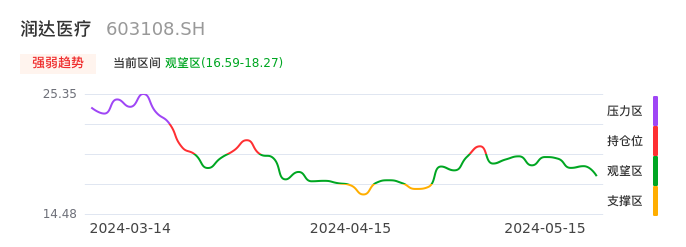 我们来看一下该股的九方特色指标强弱趋势的情况:润达医疗自04月30日从持仓区下穿到观望区,股价近期持续走弱。短期已经进入空头行情,且下跌动能仍未衰竭。建议继续谨慎观望。