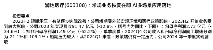 值得注意的是:2024年05月东吴证券的朱国广/徐梓煜分析师,首次发布关于润达医疗的研究报告,标题为:润达医疗(603108):常规业务恢复在即 AI多场景应用落地。