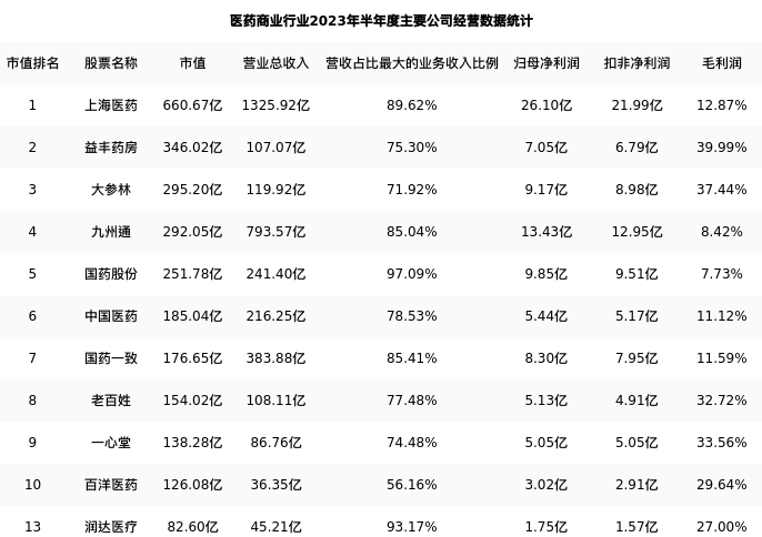 润达医疗最新报告期数据为半年度,下表汇总了医药商业行业内市值靠前的公司半年度主要经营数据
