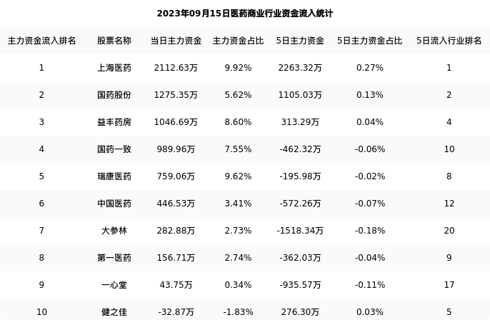 从主力资金流向来看,医药商业行业今日主力资金流入6.94亿元,在所有申万二级行业中排名:20/131。